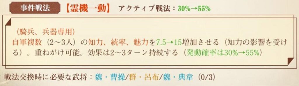 - コメント・・騎兵と兵器専用のアクティブ戦法で、とっさに起点を利かすといった意味のようです。知力がどれくらいの武将かわかりませんでしたが、調べたところ50~70程度は属性が上がるようです。