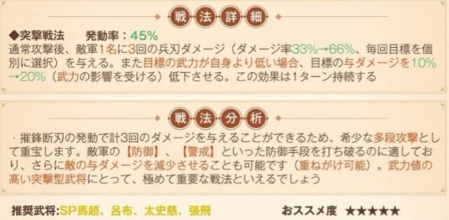 - コメント・・一騎当千と似ていて一騎当千はダメージ期待値が97.2ですが、この戦法は89.1でダメージ期待値としてはやや劣ります。その代わり相手の与ダメージを50%近く下げる事ができます。通常攻撃機会の多い呂布やSP馬超、太史慈などに覚えさる事で活躍が期待されます。