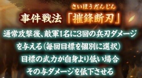 - コメント・・回復増加+計略ダメージを与える事ができる戦法。等風騎を中心に使用される。