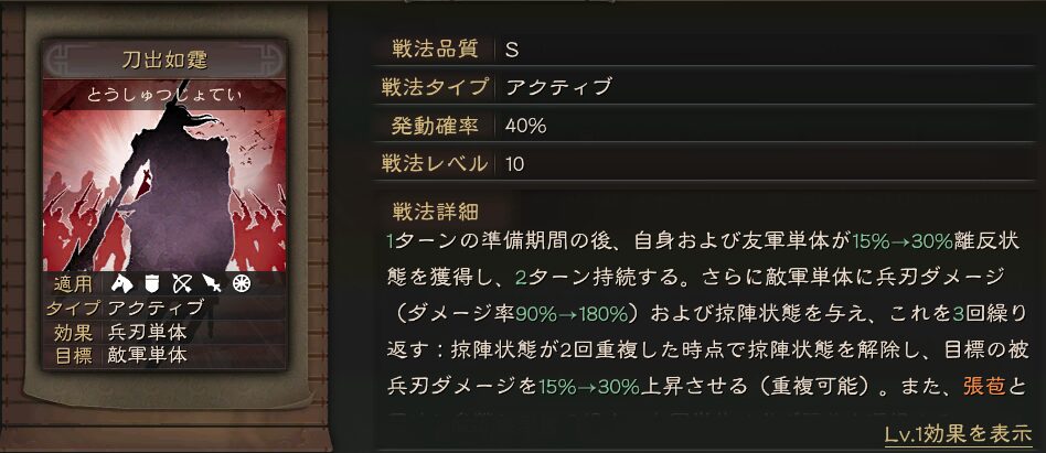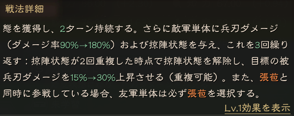 準備ターンありのアクティブ戦法で、離反+兵刃ダメージ+デバフ効果があります。