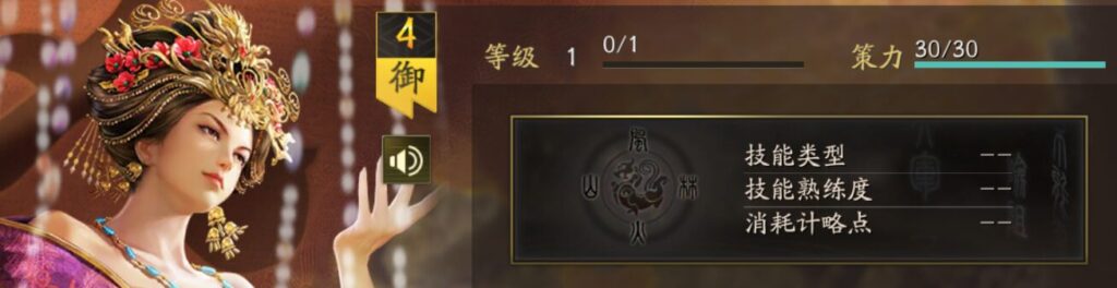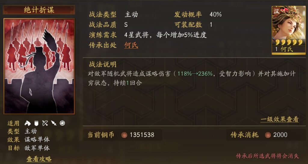 自身は心攻を5%獲得し、重複可能、戦闘終了まで持続する。さらに敵軍複数(2人)に計略ダメージを与える(ダメージ率:64%→128%、知力の影響を受ける)。もし対象の武力が自身より高い場合、追加でその対象に謀略ダメージを与える(ダメージ率:49%→98%、知力の影響を受ける)。