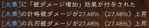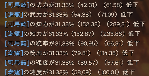 固有戦法では能力値を下げる効果、被ダメージを増加させる効果、すべての間隙を発動させた場合の能力値を下げる効果、それぞれに知力の影響を受けます。