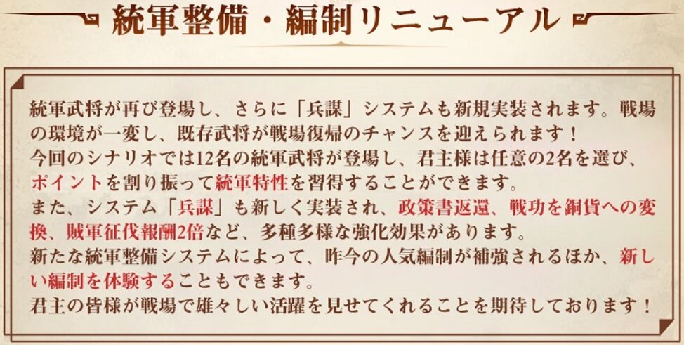 シーズン21「長安の乱」で実装された東軍整備システムですが、対象武将やシステム面が変更されシーズン22「兗州の戦い」でも登場することになります。
