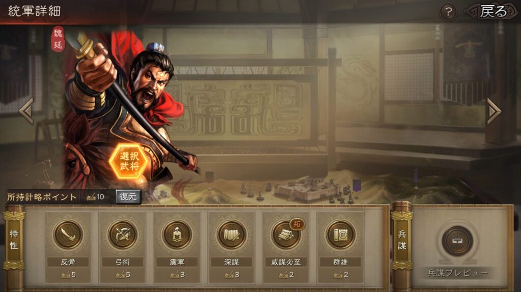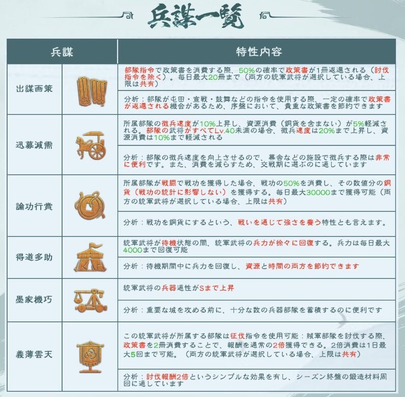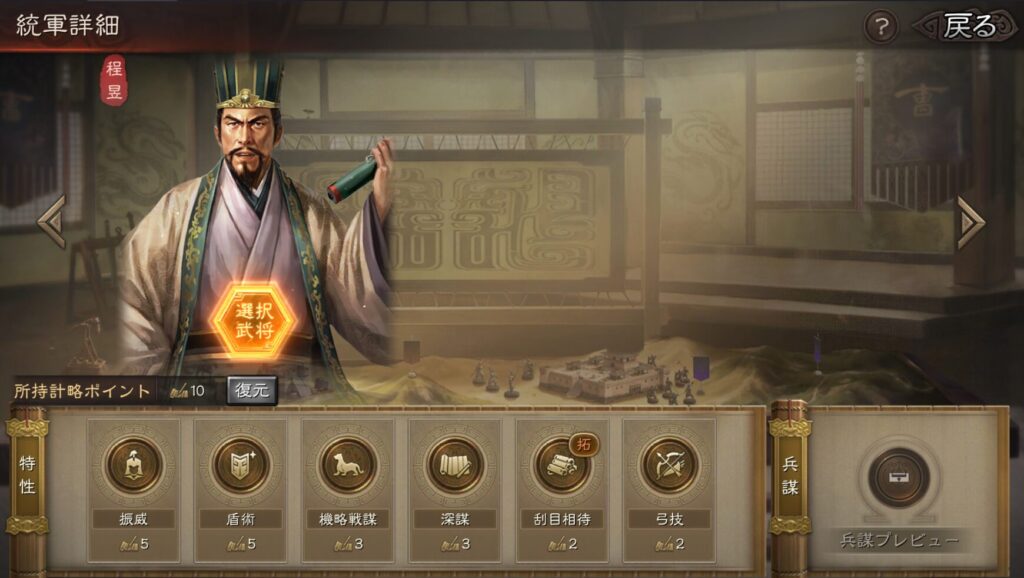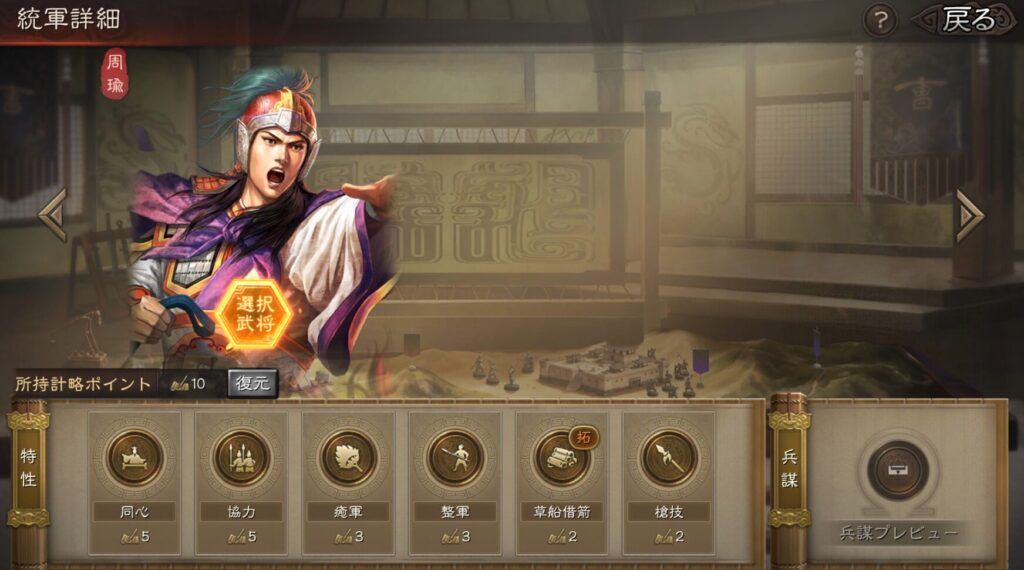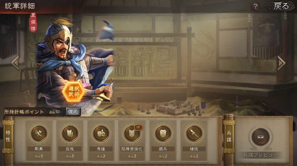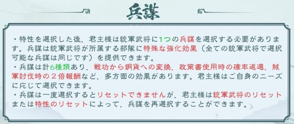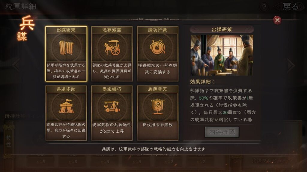 統軍武将を選んで技を覚えさせるほかに、兵謀というものが存在します。特殊な部隊強化効果があるのでどの兵謀を選択するか事前に検討しておきましょう。
