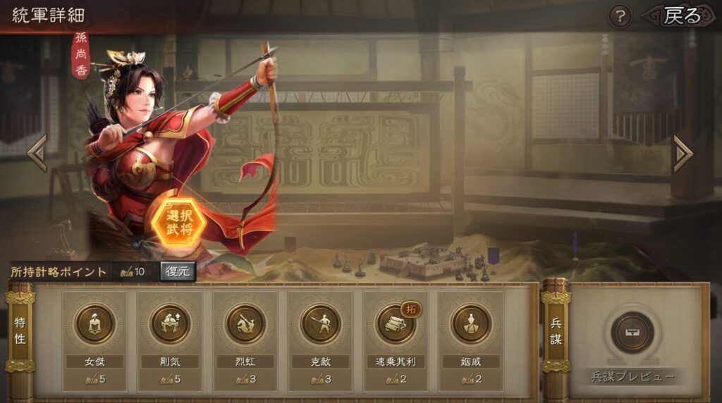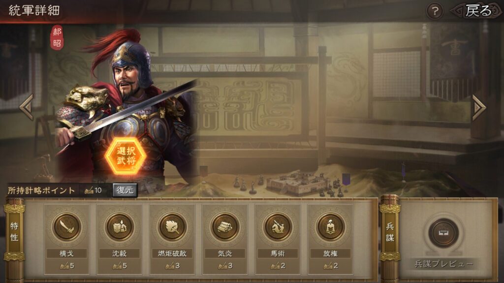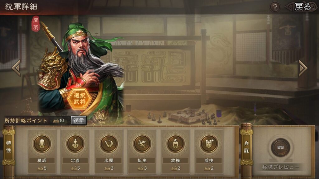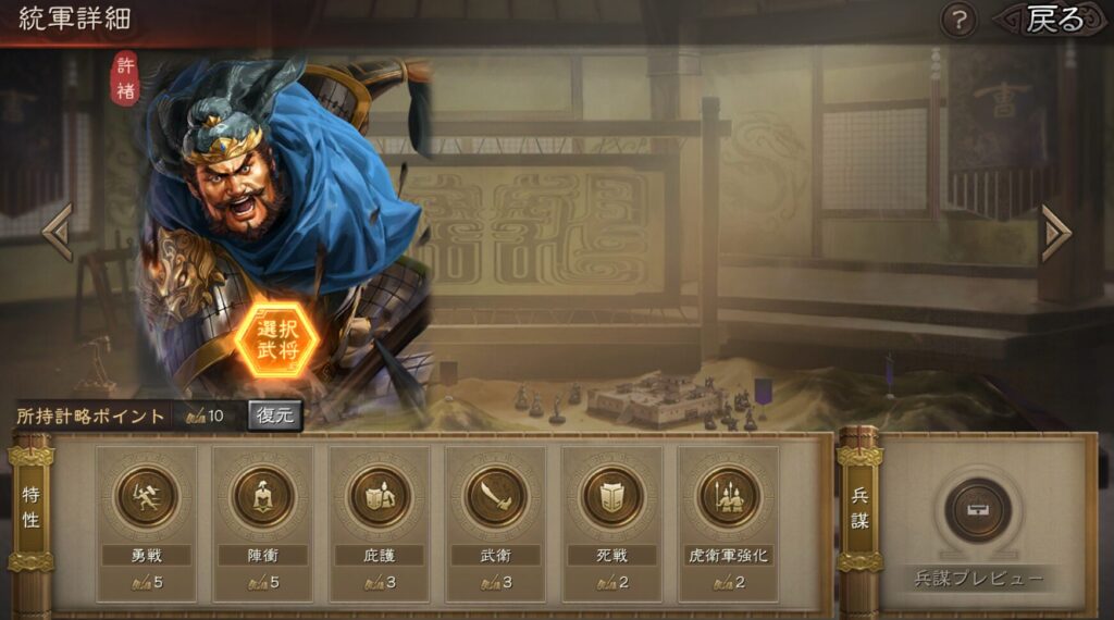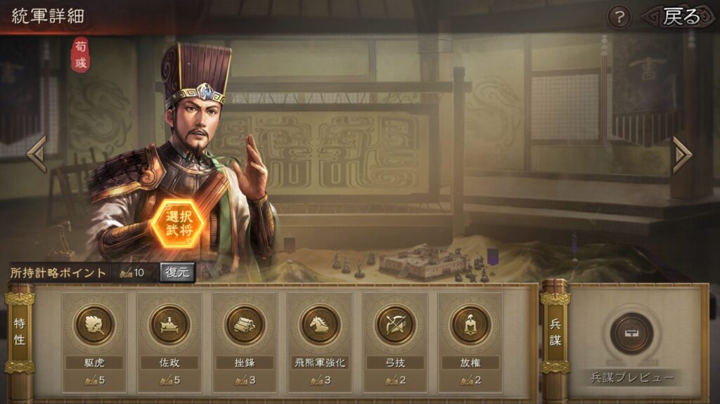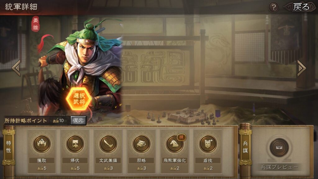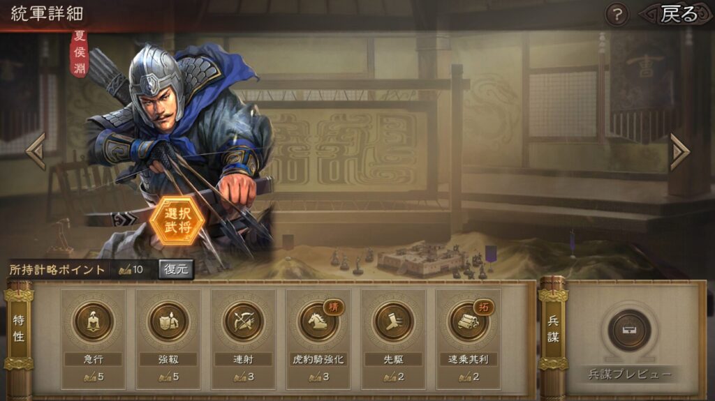 統軍武将を選んで技を覚えさせるほかに、兵謀というものが存在します。特殊な部隊強化効果があるのでどの兵謀を選択するか事前に検討しておきましょう。