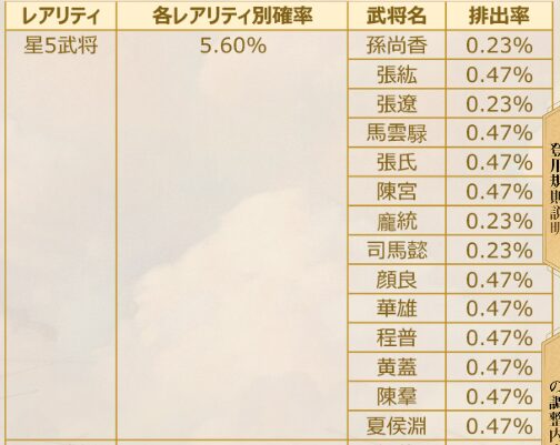 曹操、劉備、孫権、諸葛亮、許攸、馬忠、王異、馬岱の8名が目玉武将として表記されていますが、おそらく前回同様にこれらの武将の排出確率が底上げされたパックになるでしょう。