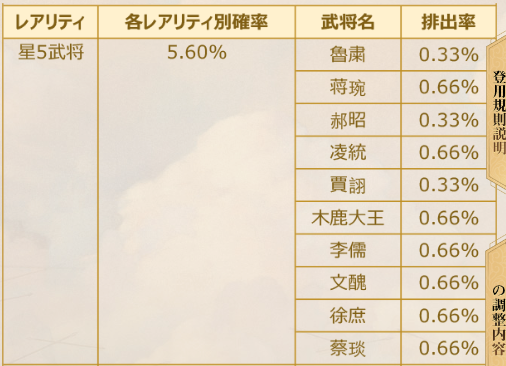 賈詡は魅力的ですが、魯粛と郝昭はそこまで使用率は高くないです。高排出枠もいらない武将ばかりで魅力を感じないパックです。