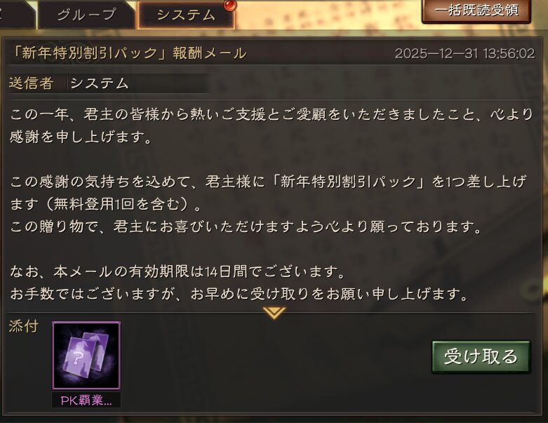 購入するとゲーム内のメールで送られてくるので好きなパックを選択して受け取ります。