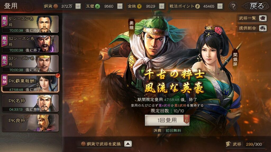 10回以内に星5武将が確定で入手できると思うので、星5武将が1枚でも入手できた時点でやめるのがいいでしょう。