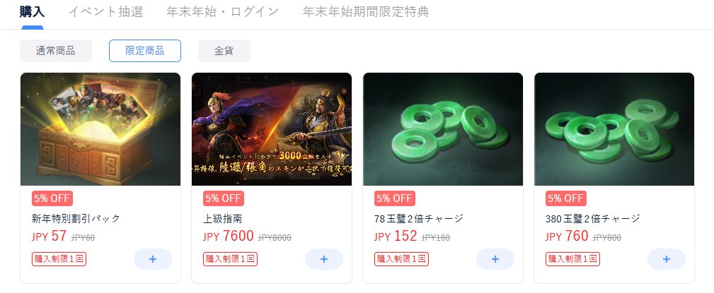 シーズン1以外の人はラインナップは覇業パックと同じです。どのガチャがいいかは手持ちの武将によるので何とも言えませんが、覇業4はSP貂蝉が欲しい人以外は引く価値はなさそうです。
