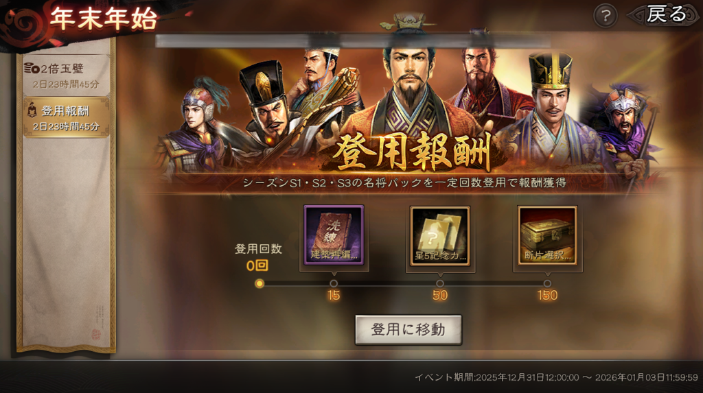 前回同様に15回、50回、150回回すごとに登用報酬があります。