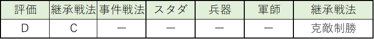 名前 | よみ | 評価 | 継承戦法 | 事件戦法 | スタダ | 兵器 | 軍師 | 継承戦法 | 事件戦法 |