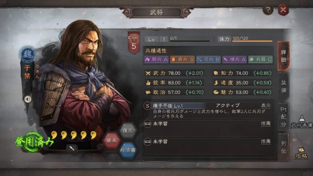 兵種適正は割と高いですが、武力特化型にも関わらず固有戦法は回復戦法(武力の影響)で、扱いにくい武将です。