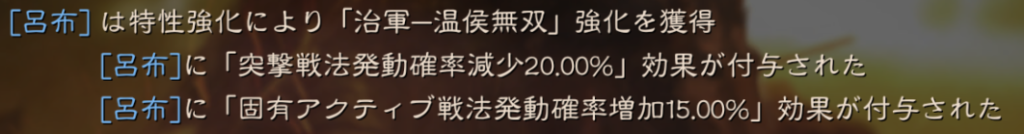 統軍整備システムがある場合限定ですが、突撃戦法の発動確率を下げて固有アクティブ戦法の発動確率を上げることができるので、この効果を採用する場合は突撃戦法を覚えさせずに、忠勇義烈、気凌三軍、引弦力戦などを採用してもいいでしょう。