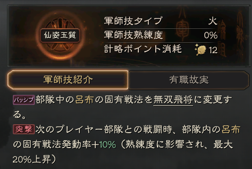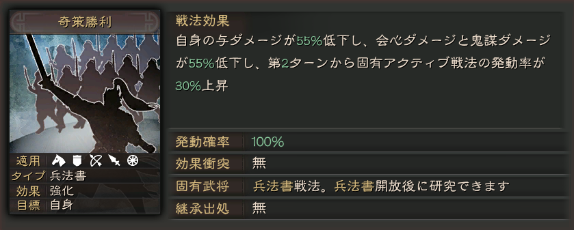 また、軍師技で固有戦法の発動確率を20%も上げることができるので、上手く活用すれば戦功もたくさん稼ぐ事ができます。