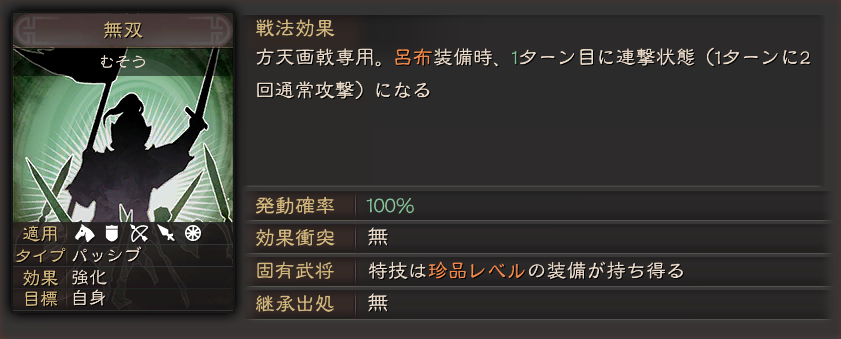 ※呂布は貂蝉の軍師技で固有戦法の変更、無双&乱打スキルを装備