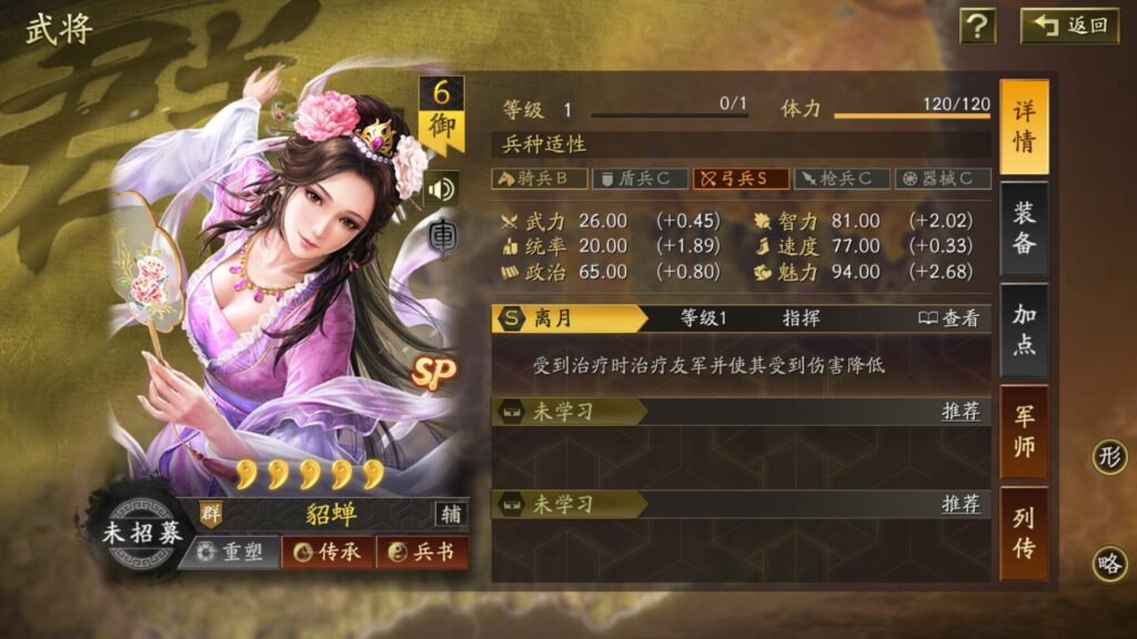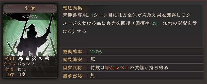 三軍救助で応急を、久戦で離反(心攻も)を獲得できるのでSP貂蝉と相性がいい兵法書です。