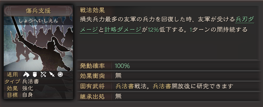 傷兵支援で被ダメ減を狙うか、三軍救助+統軍+久戦で耐久力を上げつつ回復機会を増やすのか分かれています・