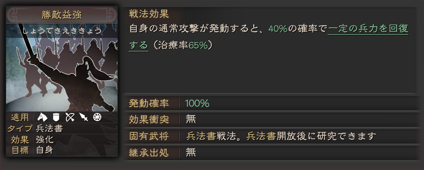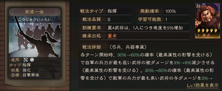 剛柔一体は最高属性の影響を受けるので、どの武将に覚えさせるかはランクアップ具合や他の戦法との兼ね合いで考えていく必要があります。