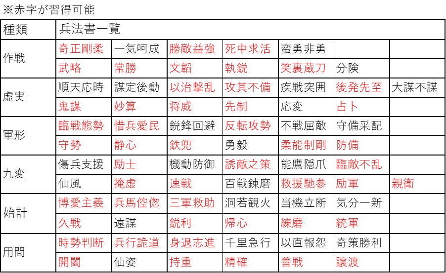 固有戦法によって被ダメ機会が多くなるので、耐久力を上げる事ができる惜兵愛民+守勢+防備か、三軍救助+統軍+練磨がおすすめです。