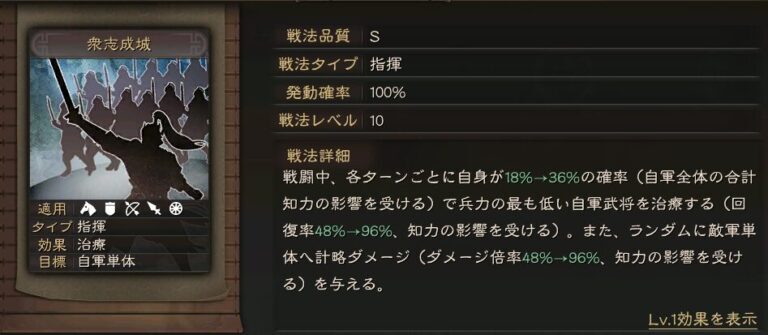 固有戦法は指揮戦法となっていて、味方主将の心攻・鬼謀発生率を増やす効果があります。