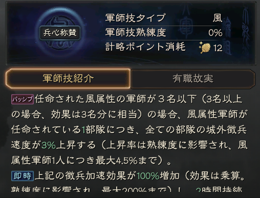 継承戦法は指揮戦法で、暫避其鋒のような耐久力を上げる戦法となっています。