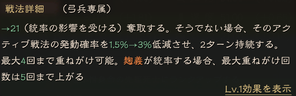発動すれば70%の確率で、固有戦法ではないアクティブ戦法を100%発動させる事ができます。