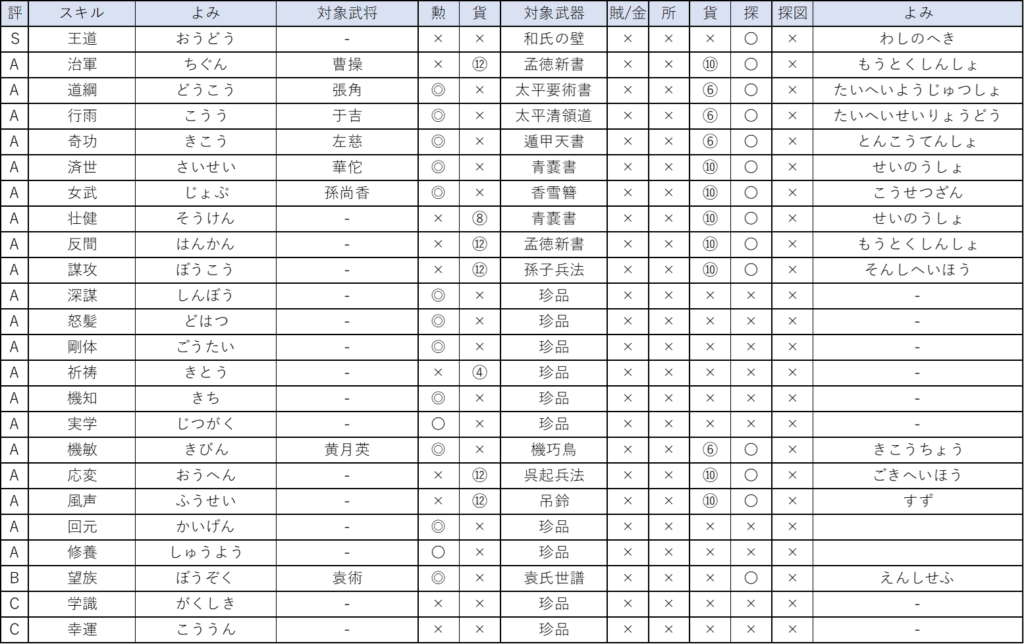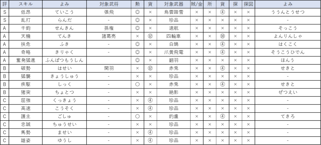 スキルは購入で入手できないので入手難易度は高いです。方天戟の図面は賊狩りでも入手できるので、奸雄よりは若干入手しやすくなっています。