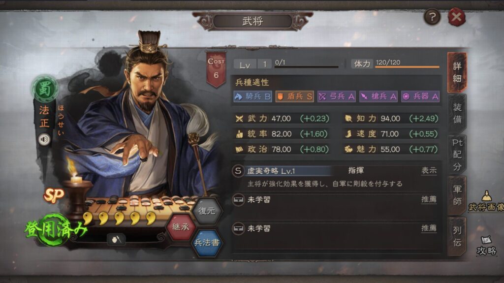 ノーマル法正と比べると兵種適正は同じですが、コストが4→6に変更になっていて、属性値の伸び率が異なっています。