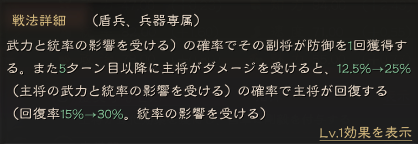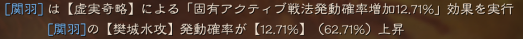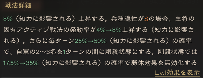 主将の兵種適正がSの場合、同じく知力365.22で12.71%アクティブ戦法の発動確率が上昇されます。