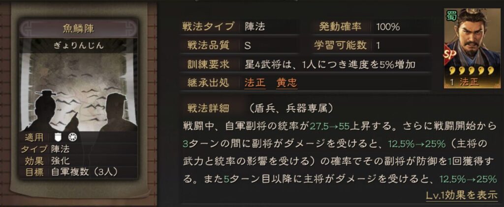 - 継承戦法の魚鱗陣はSP黄忠から継承した方がいい。