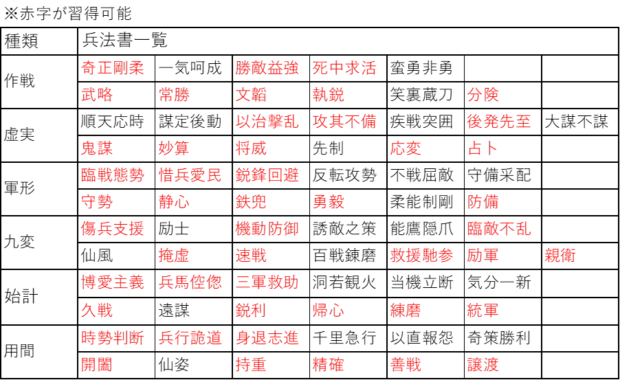 ノーマル法正と同じく回復サポート武将になるので、傷兵支援+励軍+掩虚や惜兵愛民+守勢+防備、三軍救助+統軍+練磨の組み合わせがいいでしょう。