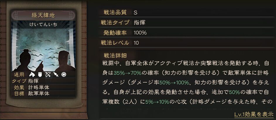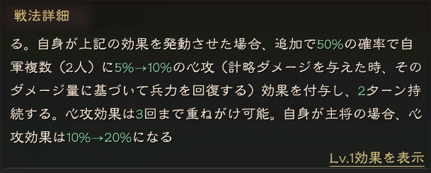 シンプルな内容で、自軍が突撃orアクティブ戦法発動時に確率で計略ダメージを与える事ができます。