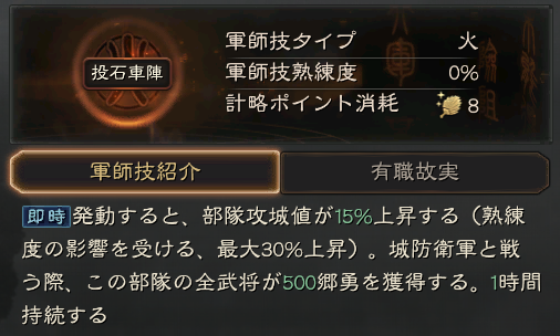 黄月英には劣りますが、数少ない攻城系の軍師技になります。