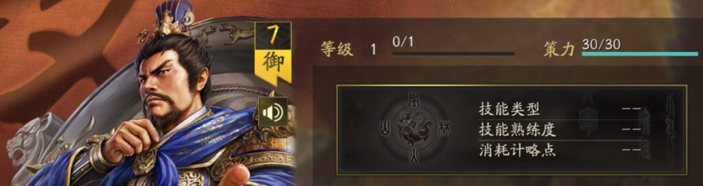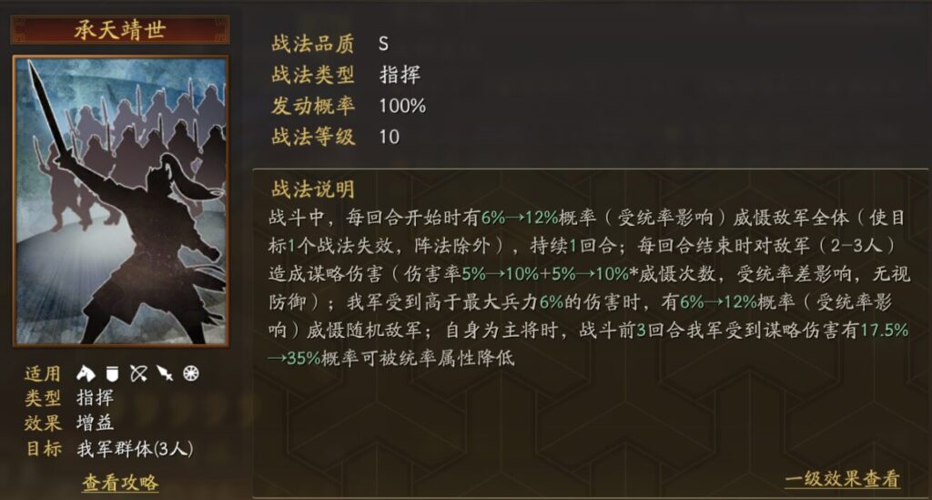 戦闘開始から最初の2ターン、自身が受ける通常攻撃ダメージが10%→20%低下(統率の影響を受ける)。3ターン目以降、自身のアクティブ戦法発動率が4%→8%上昇(武力の影響を受ける)。さらに、ダメージを与える際に15%→30%の確率(武力の影響を受ける)で、10%→20%の破陣効果(武力の影響を受ける)を得る。