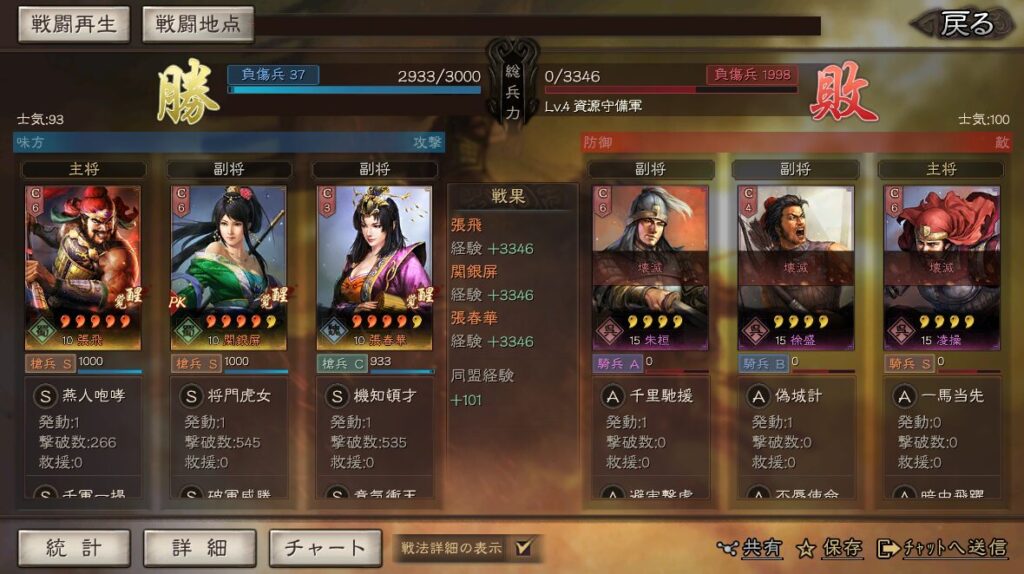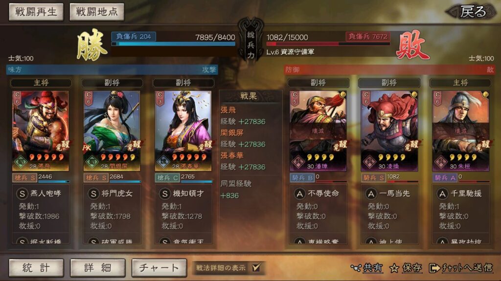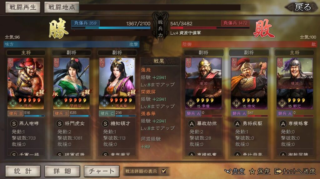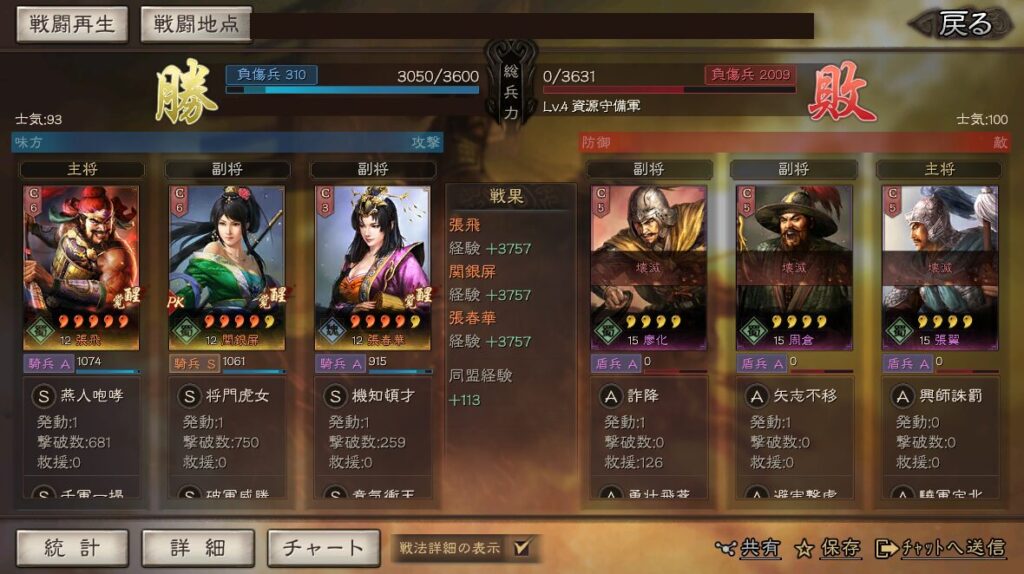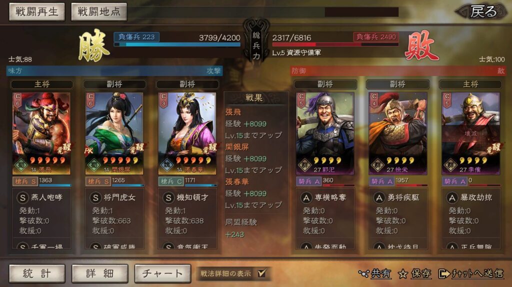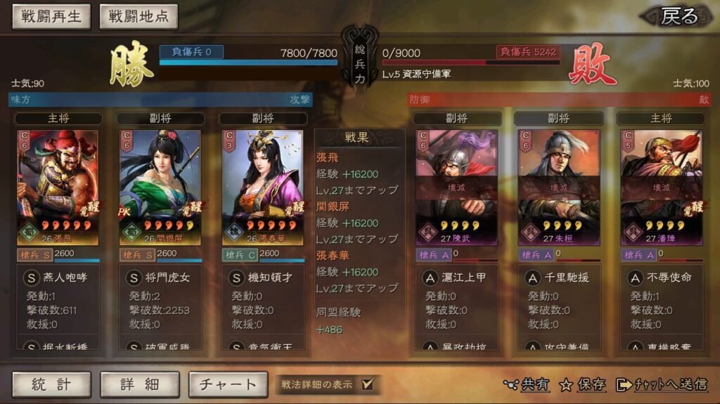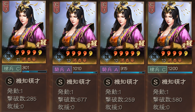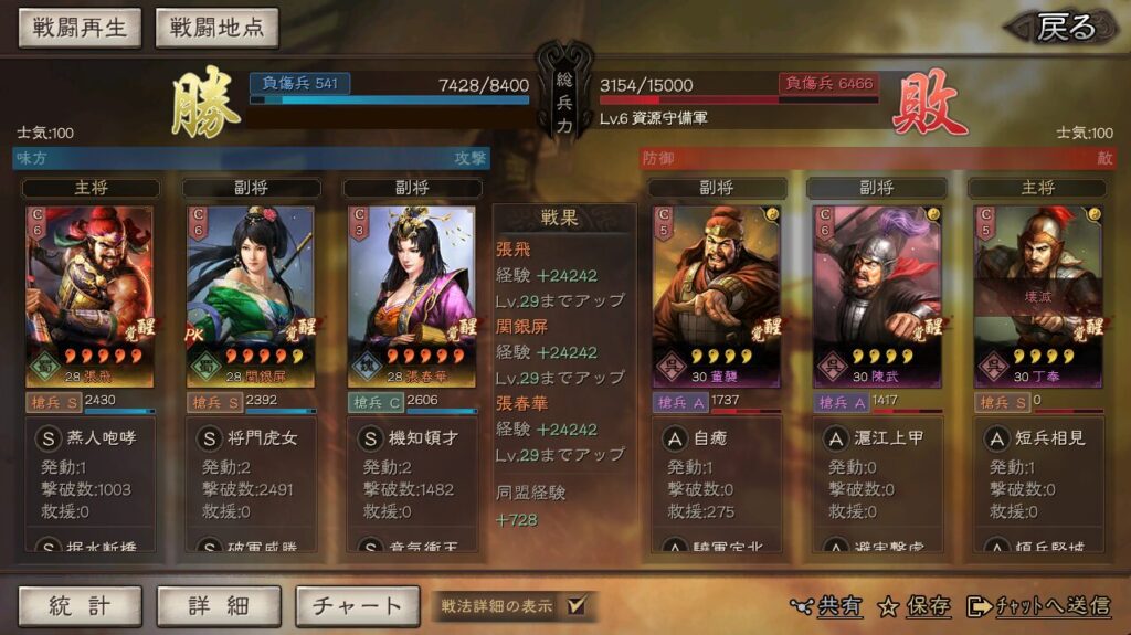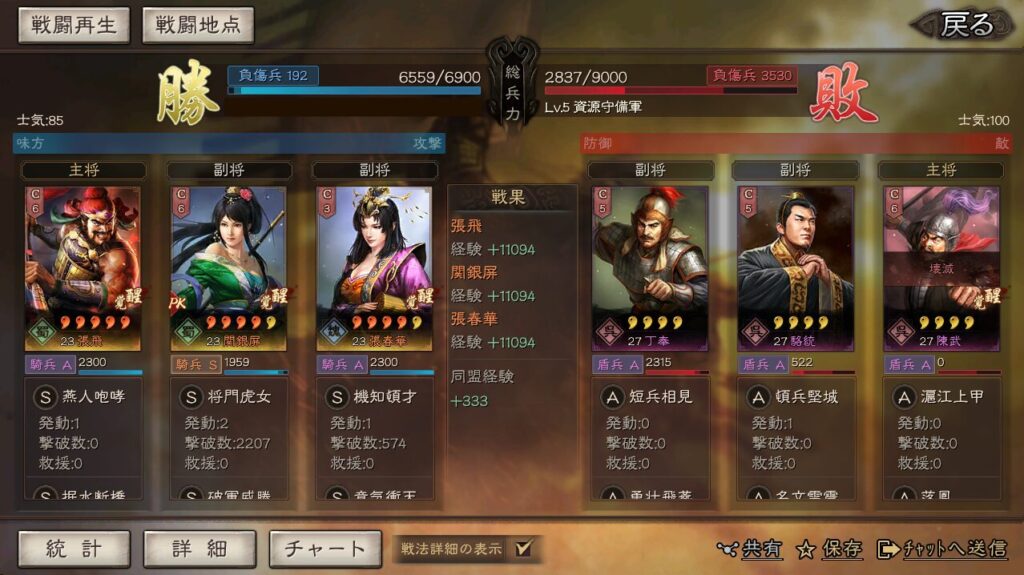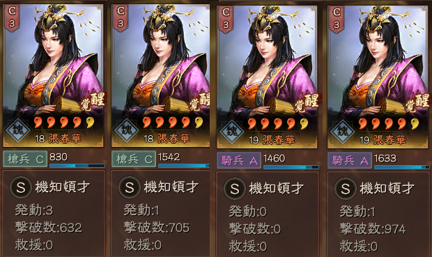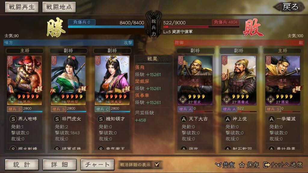 - 張春華は李典と比べ統率が低いので兵損は多くなりがちだが、その分攻撃力でカバーできている。