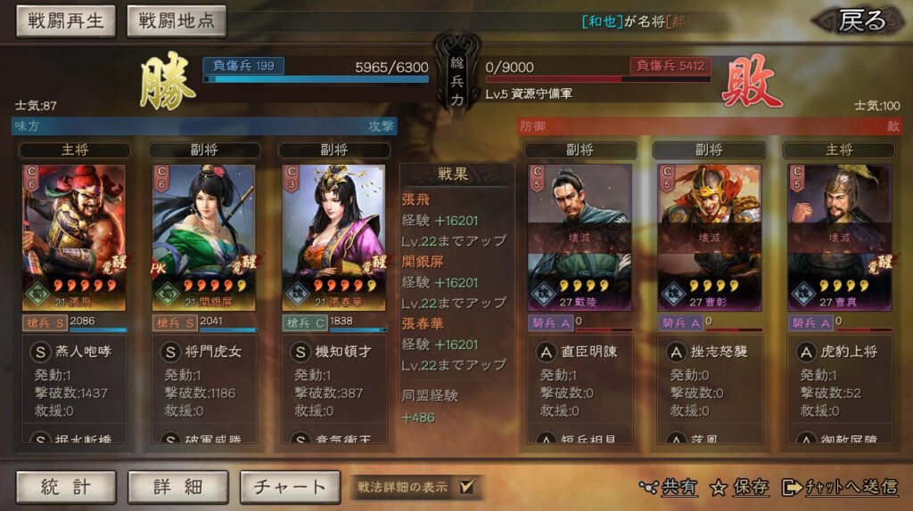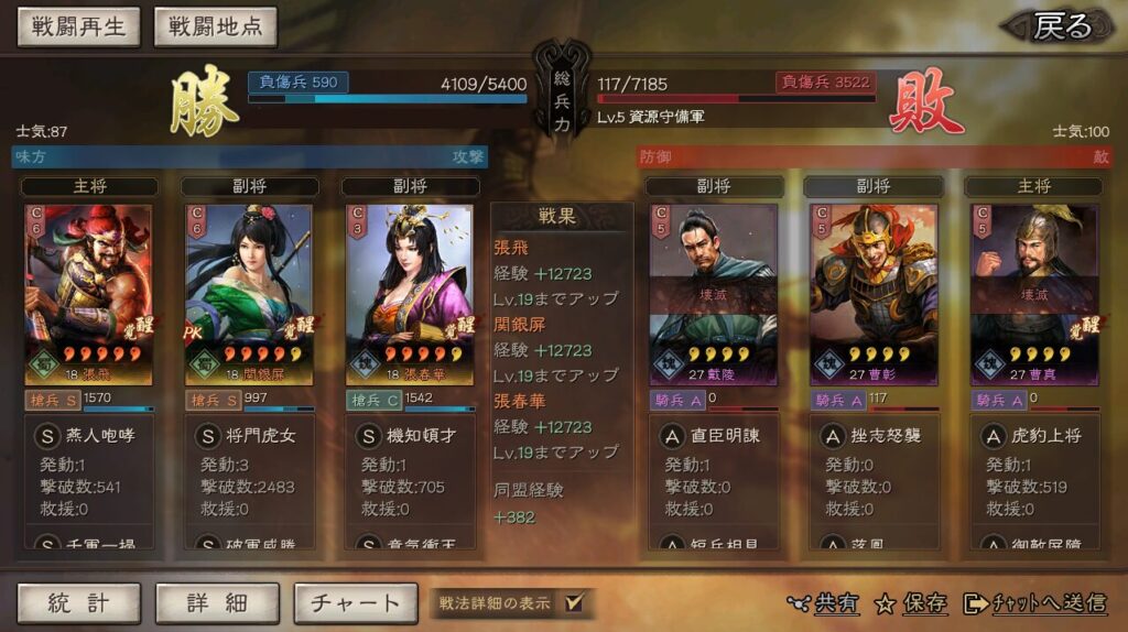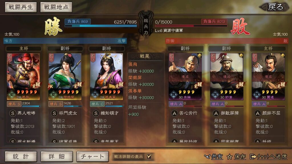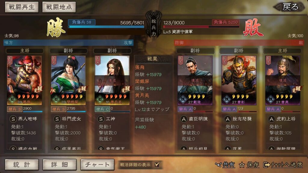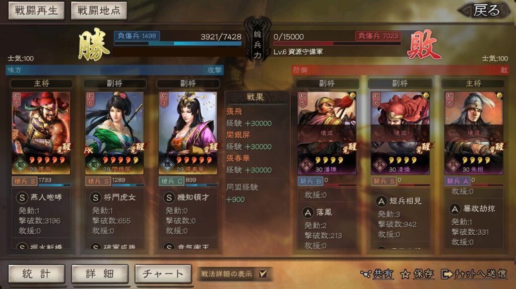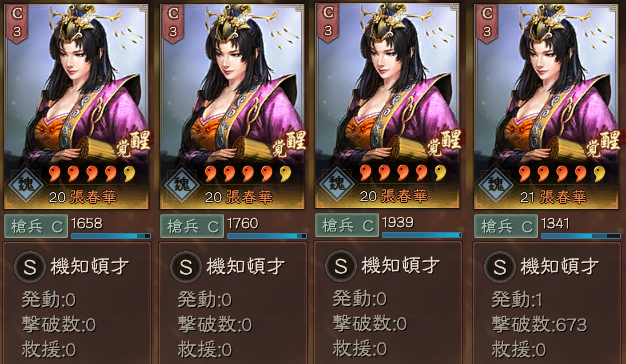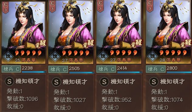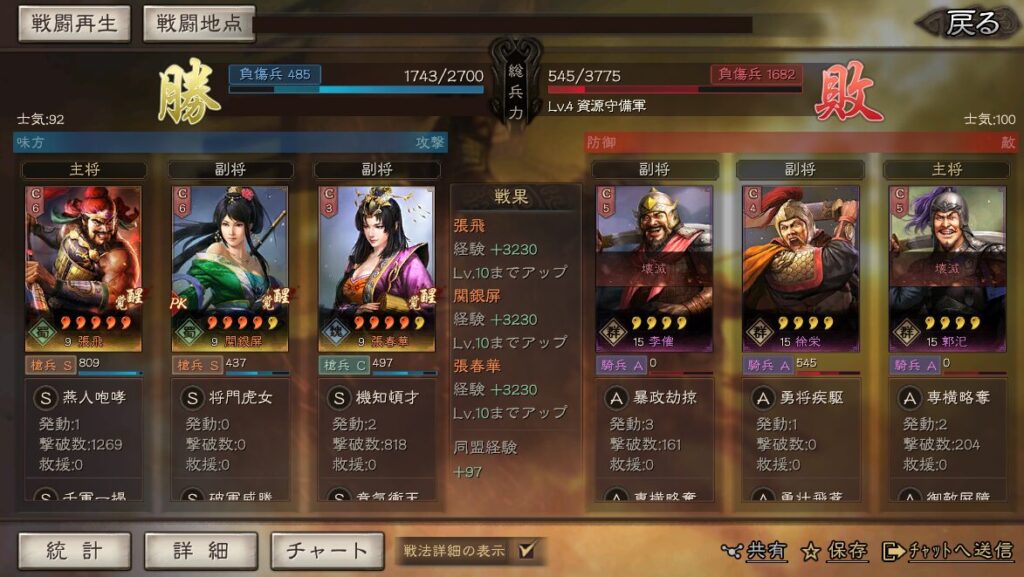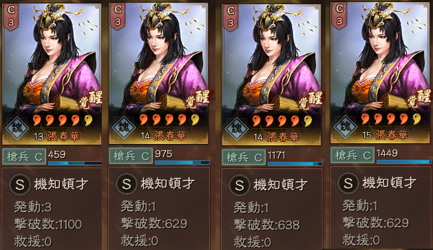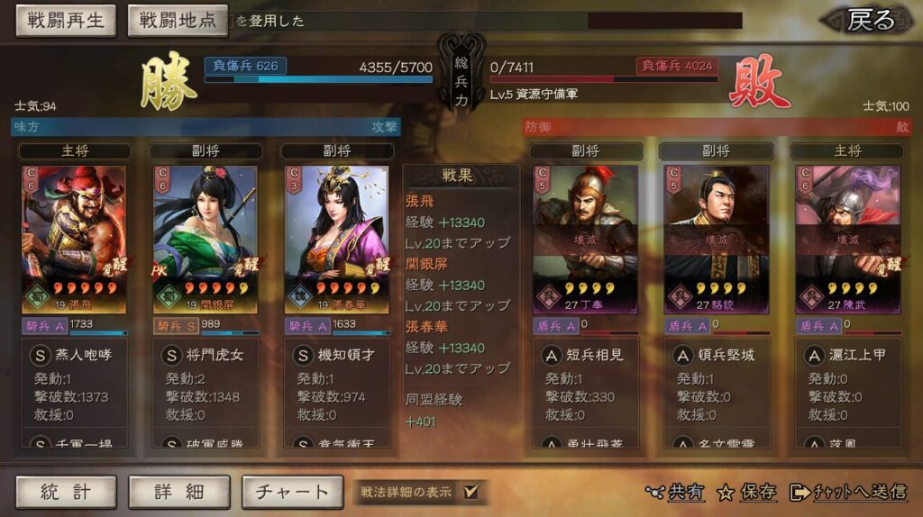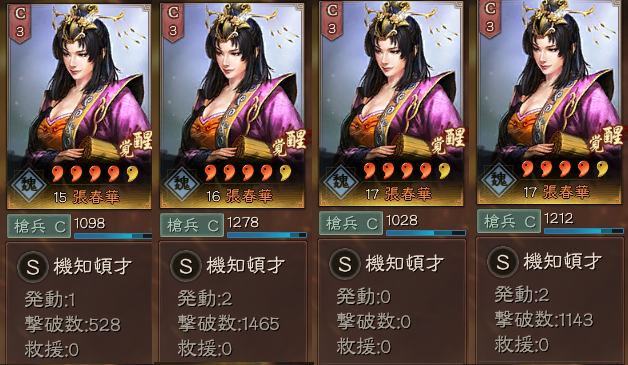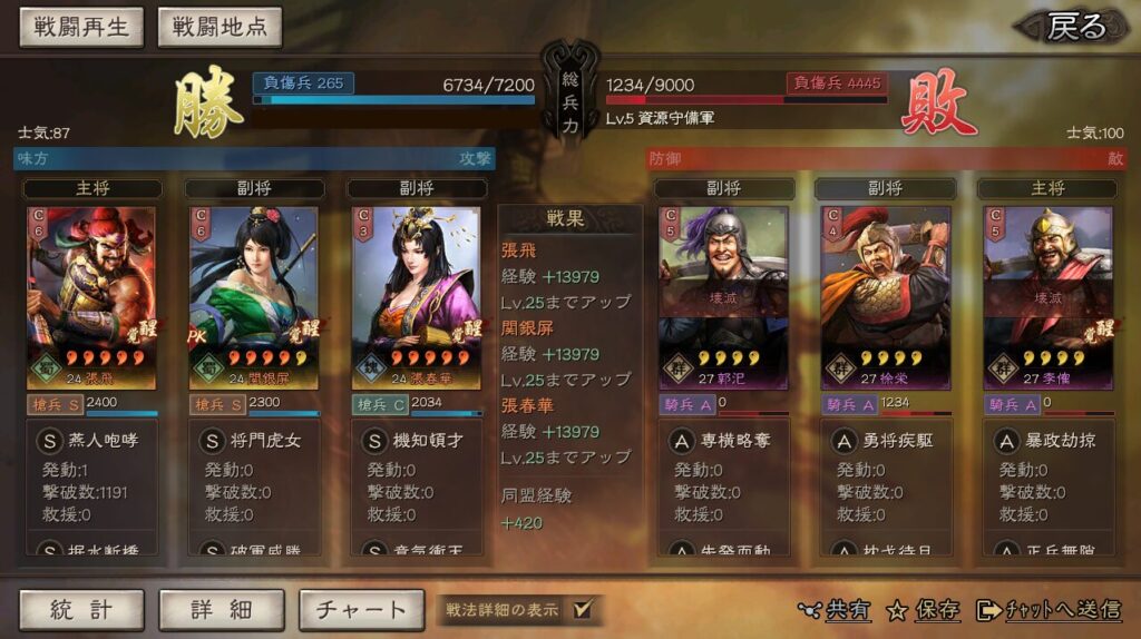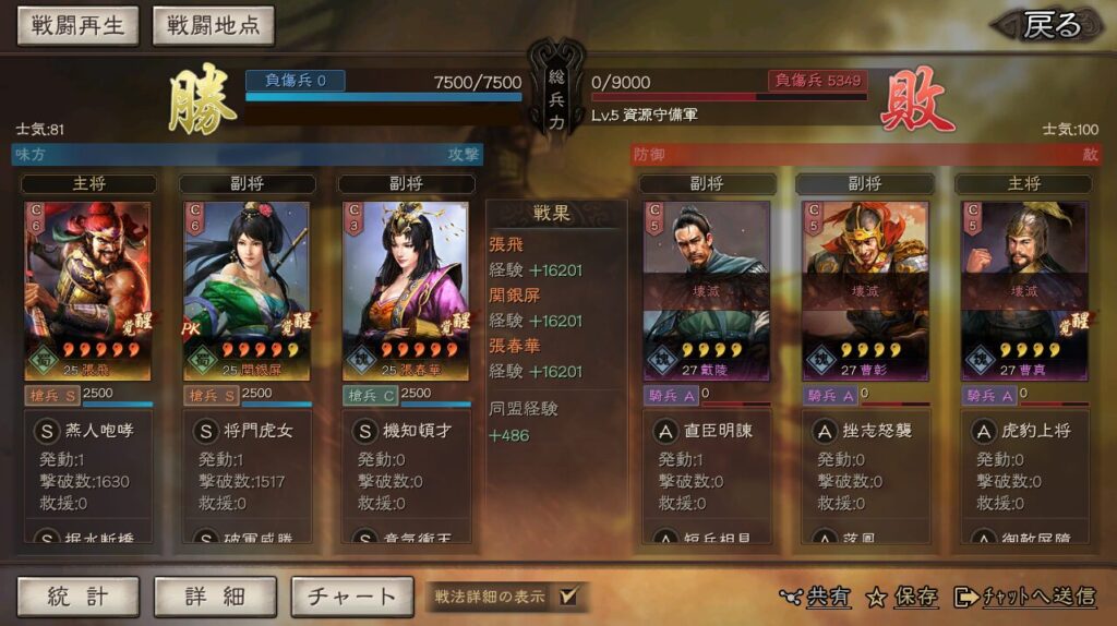 - 張春華は李典と比べ統率が低いので兵損は多くなりがちだが、その分攻撃力でカバーできている。
