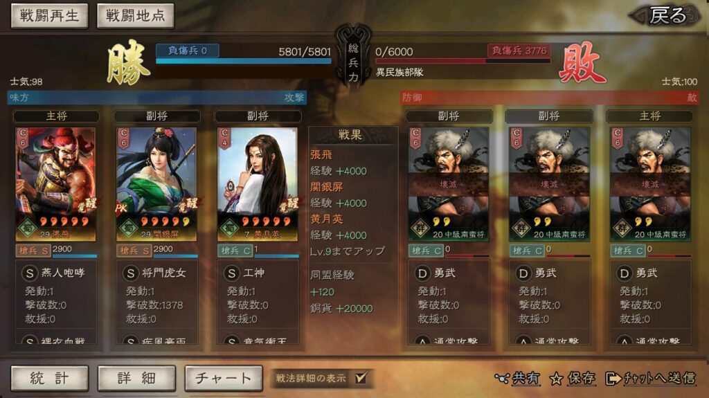 2つ目の土地6へ挑戦。2戦目は有利兵種にも関わらず兵損多めです。関銀屏と張春華が落鳳で砕心状態になってやや下ぶれていました。