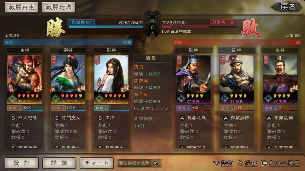 千軍一掃、将門虎女、破軍威勝が発動0で兵損多めですが、機知頓才でそこそこダメージが出ています。