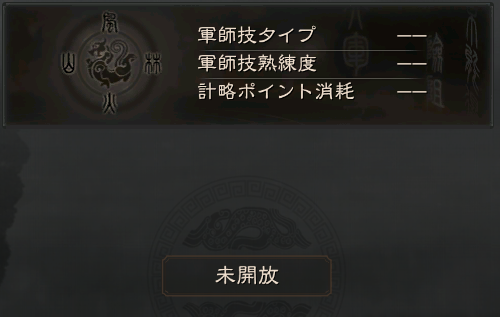 効果:4ターンの間、自軍全体のアクティブ戦法、突撃戦法発動時に、75%の確率で自軍全体の被ダメージを2%減(1ターン持続し、最大5回重ねがけ可)