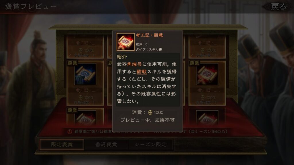 登場時期に少し見かけたくらいで現在はほとんど見かける事ないので、入手よりも太史慈のランクアップを進めた方がいいでしょう。