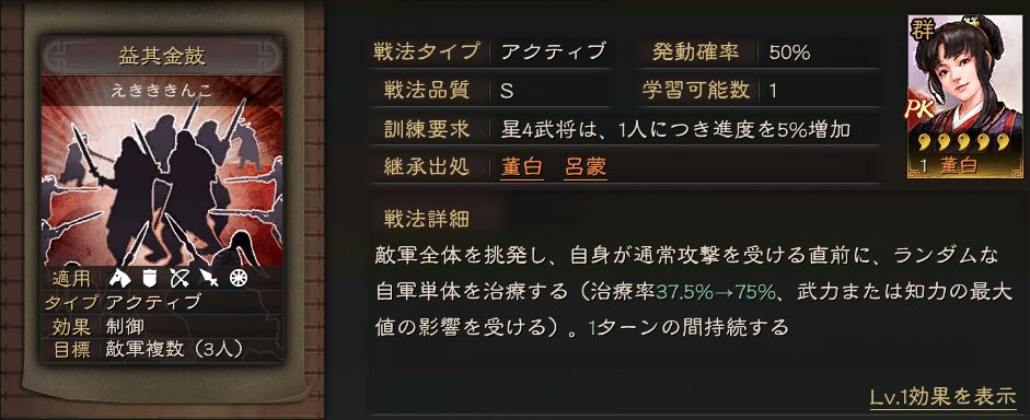 継承戦法は挑発系のアクティブ戦法となっていて、董白に覚えさせると固有戦法の能力を活かす事ができます。