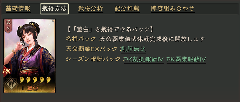 PKシーズン以降の名将ガチャ、ピックアップガチャ剛胆無比で獲得機会があります。