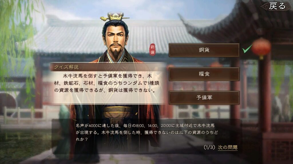 城の予備軍が上限まで達している時に木牛部隊を倒しても、上限以上には予備軍は獲得できないので、倒すときは予備軍の枠が空いている時がおすすめです。